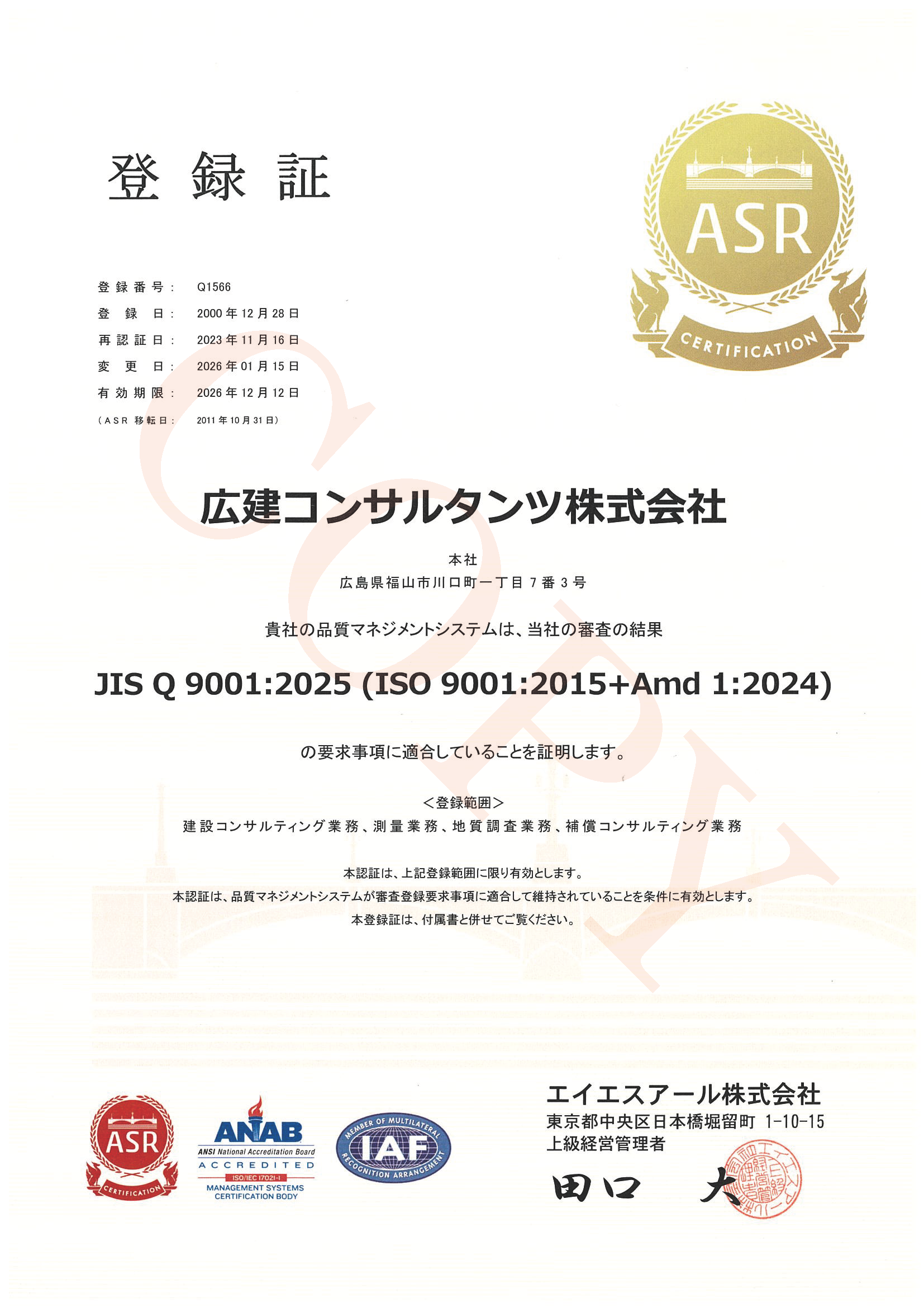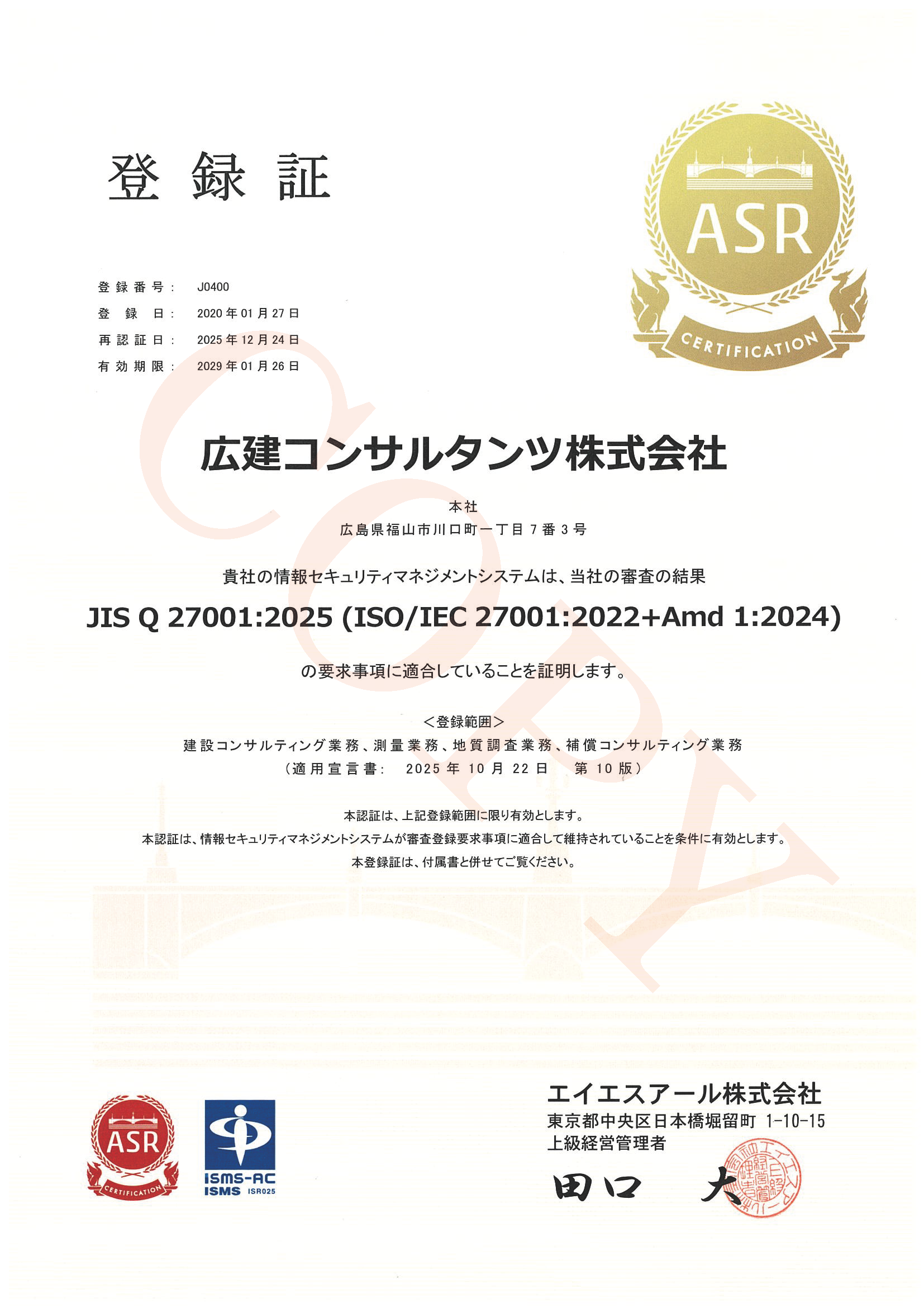 当社は、品質管理、環境マネジメントおよび情報セキュリティの国際規格、ISO9001,ISO14001,ISO/IEC27001の認証取得企業です。「品質確保・向上と工期厳守は我々の最大の使命」を品質方針に掲げ、 顧客の満足と信頼を獲得するため、ISOシステムをツールとして、 さらなる品質の確保・向上を図っていきます。